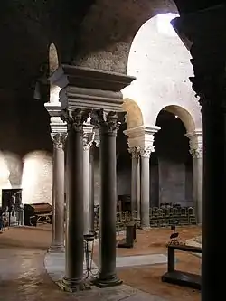 Colonnes géminées en granite gris et rose dans l'église paléochrétienne Santa Costanza à Rome, datant du IVe siècle.
