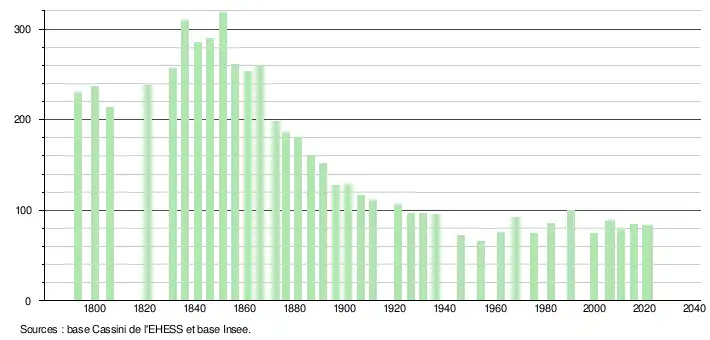 L'évolution du nombre d'habitants est connue à travers les recensements de la population effectués dans la commune depuis 1793. Pour les communes de moins de 10 000 habitants, une enquête de recensement portant sur toute la population est réalisée tous les cinq ans, les populations légales des années intermédiaires étant quant à elles estimées par interpolation ou extrapolation[23]. Pour la commune, le premier recensement exhaustif entrant dans le cadre du nouveau dispositif a été réalisé en 2005[24].