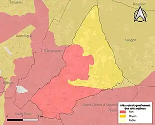 Le retrait-gonflement des sols argileux est susceptible d'engendrer des dommages importants aux bâtiments en cas d’alternance de périodes de sécheresse et de pluie. La totalité de la commune est en aléa moyen ou fort (67,4 % au niveau départemental et 48,5 % au niveau national). Sur les 274 bâtiments dénombrés sur la commune en 2019, 274 sont en aléa moyen ou fort, soit 100 %, à comparer aux 84 % au niveau départemental et 54 % au niveau national. Une cartographie de l'exposition du territoire national au retrait gonflement des sols argileux est disponible sur le site du BRGM[21],[Carte 2].