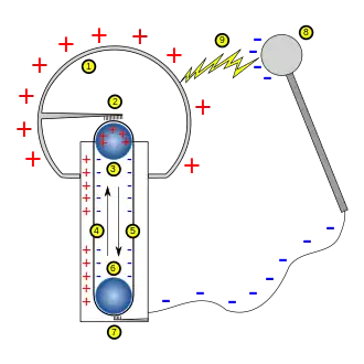 Cette tension élevée ionise l'air près de la pointe de E1 ce qui permet de pousser les charges positives vers la courroie et de permettre leur déplacement sur la face interne de l'enveloppe sphérique. Cette charge positive sur la sphère induit une charge négative sur l'électrode E2. La forte différence de potentiel ionise l'air à l'intérieur de la sphère et les charges négatives sont repoussées sur la courroie, ce qui a pour effet de la décharger. Selon le principe de la cage de Faraday, les charges positives de E2 migrent vers la sphère indépendamment de la tension existante à sa surface. Comme la courroie continue à tourner, un courant constant arrive par ce moyen en direction de la boule qui continue de recevoir des charges positives. Ce chargement se poursuit jusqu'à un certain point qui dépend des caractéristiques de la sphère. Plus l'enveloppe sphérique est grande, plus son potentiel est élevé. Avec une surface parfaite pour la boule métallique, la tension maximale est de l'ordre de 30 kV pour chaque centimètre de rayon[1]. Cette valeur théorique n'est pas atteinte en pratique à cause des imperfections du système (surface irrégulière, pertes, etc.)