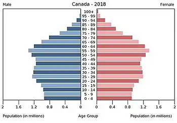 Statistique Canada a indiqué en 2015 que pour la première fois dans l'histoire du Canada, il y avait plus de personnes âgées de 65 ans et plus que de personnes de moins de 15 ans. Un Canadien sur six était âgé de plus de 65 ans en juillet 2015. Si cette tendance se poursuit, il y aura trois personnes âgées pour deux enfants de moins de 15 ans dans 20 ans[80].