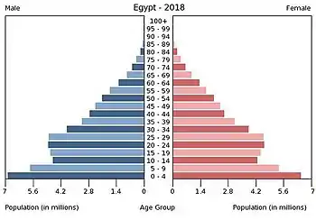 La population égyptienne a franchi le cap des 100 millions d'habitants en février 2020. Selon les chiffres du gouvernement, au cours des années 1990 et 2000, le taux de fécondité de l'Égypte est passé de 5,2 à 3,0, avant de remonter à 3,5 en 2018, selon les Nations unies. Si le taux de croissance actuel se poursuit, l'Égypte comptera plus de 128 millions de personnes d'ici 2030. Une croissance démographique aussi rapide est une source d'inquiétude dans un pays marqué par la pauvreté, le chômage, les pénuries d'eau potable, le manque de logements abordables et les embouteillages. La dureté de la géographie exacerbe le problème : 95 % de la population vit sur seulement 4 % du territoire, une région située dans le voisinage du Nil et dont la taille équivaut à peu près à la moitié de celle de l'Irlande. Le président égyptien Abdel Fattah al-Sissi a affirmé que la surpopulation constituait une menace pour la sécurité nationale au même titre que le terrorisme. Il a lancé une campagne intitulée «Deux c'est assez» afin d'endiguer le problème, mais en vain. Le taux de fécondité de l'Égypte a fait un bond aux alentours du Printemps arabe, probablement en raison du chaos politique, de l'incertitude économique et du tarissement des fonds destinés au contrôle des naissances par les gouvernements occidentaux. Les taux de fécondité sont restés les plus élevés dans les zones rurales, où les enfants sont considérés comme une bénédiction, mais l'impact est plus visible dans le Grand Caire, une mégapole abritant plus de 20 millions de personnes. En général, les villes et villages densément peuplés d'Égypte comptent un million de résidents supplémentaires chaque année entre 2008 et 2018[23].