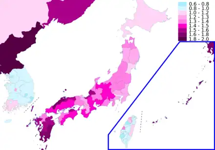 Au rythme actuel, Taïwan devrait passer d'une société âgée à une société super-âgée, où 21 % de la population a plus de 65 ans, en huit ans, contre sept ans pour Singapour, huit ans pour la Corée du Sud, 11 ans pour le Japon, 14 pour les États-Unis, 29 pour la France et 51 pour le Royaume-Uni[44]. En 2018, le Japon était déjà une société super-âgée[45], avec 27% de sa population âgée de plus de 65 ans[13]. Selon les données gouvernementales, l'indice synthétique de fécondité du Japon était de 1,43 en 2017[48]. Selon l'Institute for Health Metrics and Evaluation, le Japon a l'une des populations les plus âgées au monde, avec un âge médian de 47 ans en 2017[26].