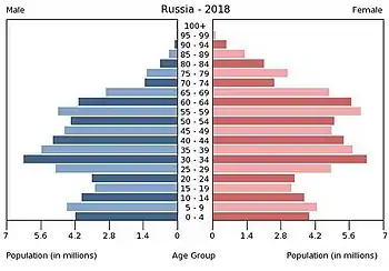 La Division de la population des Nations unies a prévu que la Russie, dont le taux de natalité était de 1,75 en 2018, verrait sa population chuter de 143 millions à 132 millions d'ici 2050[13]. La population de la Russie est en déclin depuis les années 1990, après l'effondrement de l'Union soviétique[62]. Une autre raison du déclin démographique de la Russie est la faible espérance de vie des hommes, qui n'était que de 64 ans en 2015, soit 15 ans de moins qu'en Italie, en Allemagne ou en Suède. Cette situation est due à la combinaison de taux anormalement élevés d'alcoolisme, de tabagisme, de cancers non traités, de tuberculose, de suicides, de violence et de VIH/sida[63]. Bien que les tentatives précédentes pour augmenter le taux de natalité aient échoué, en 2018, le président Vladimir Poutine a proposé de donner de l'argent aux familles à faible revenu, aux mères pour la première fois, aux familles ayant de nombreux enfants, et de créer davantage de crèches. Cela fait partie d'un paquet de dépenses massives visant à revitaliser l'économie russe en difficulté[62].