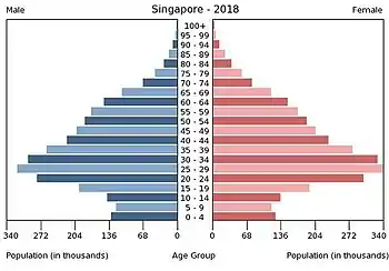 L'indice synthétique de fécondité de Singapour continue de baisser dans les années 2010, car de plus en plus de jeunes choisissent de retarder ou d'éviter le mariage et la parentalité. Il a atteint 1,14 en 2018, ce qui en fait le plus bas depuis 2010 et l'un des plus bas au monde[36]. Les raisons en sont notamment les longues heures de travail, les perturbations numériques, les incertitudes entourant le commerce mondial, le changement climatique, le coût élevé de la vie et les longs délais d'attente pour les logements sociaux[37],[38]. L'âge médian des premières mères est passé de 29,7 ans en 2009 à 30,6 ans en 2018, ce qui pose un problème car la fécondité diminue avec l'âge. Parallèlement, le taux de mortalité augmente depuis 1998 ; Singapour est désormais confrontée au vieillissement de sa population[37]. En fait, le taux de natalité de Singapour est inférieur au seuil de remplacement de 2,1 depuis les années 1980, et semble s'être stabilisé au cours des deux premières décennies du XXIe siècle. Les mesures incitatives du gouvernement, telles que le baby-bonus, se sont révélées insuffisantes pour augmenter le taux de natalité[36]. Le nombre de femmes en âge de procréer (25-29 ans) qui sont restées célibataires est passé de 60,9 % en 2007 à 68,1 % en 2017. Pour les hommes, les chiffres correspondants étaient respectivement de 77,5 % et 80,7 %. À Singapour, le taux de célibat est un déterminant majeur de la fécondité, car seuls 10 % des couples mariés n'ont pas d'enfant du tout. S'il n'est pas rare que les hommes se marient tardivement parce qu'ils sont censés s'être établis avant de se marier et être le principal soutien de famille, l'une des principales raisons pour lesquelles les femmes se marient plus tard est que l'éducation supérieure élimine le besoin de se marier pour leur survie économique[38],[alpha 1].