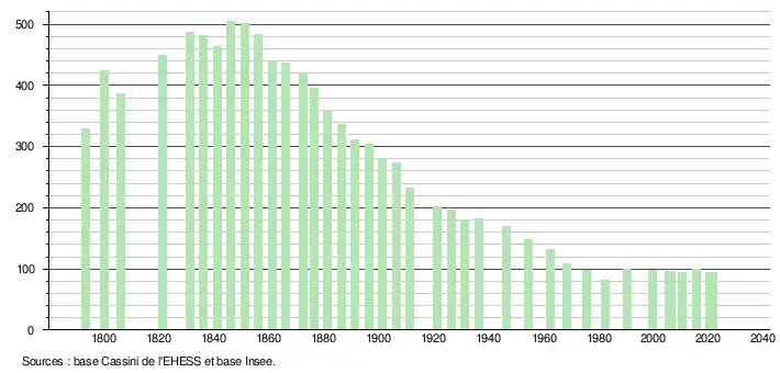 L'évolution du nombre d'habitants est connue à travers les recensements de la population effectués dans la commune depuis 1793. Pour les communes de moins de 10 000 habitants, une enquête de recensement portant sur toute la population est réalisée tous les cinq ans, les populations légales des années intermédiaires étant quant à elles estimées par interpolation ou extrapolation[32]. Pour la commune, le premier recensement exhaustif entrant dans le cadre du nouveau dispositif a été réalisé en 2005[33].