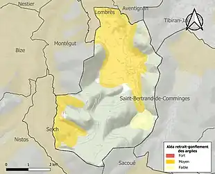 Le retrait-gonflement des sols argileux est susceptible d'engendrer des dommages importants aux bâtiments en cas d’alternance de périodes de sécheresse et de pluie. 38,3 % de la superficie communale est en aléa moyen ou fort (44,5 % au niveau départemental et 48,5 % au niveau national). Sur les 64 bâtiments dénombrés sur la commune en 2019, 61 sont en aléa moyen ou fort, soit 95 %, à comparer aux 75 % au niveau départemental et 54 % au niveau national. Une cartographie de l'exposition du territoire national au retrait gonflement des sols argileux est disponible sur le site du BRGM[23],[Carte 2].