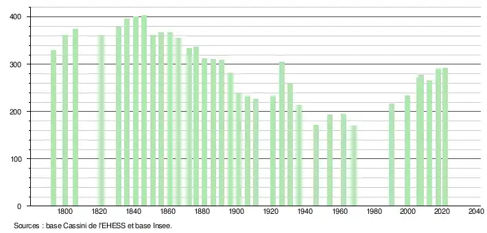 L'évolution du nombre d'habitants est connue à travers les recensements de la population effectués dans la commune depuis 1793. Pour les communes de moins de 10 000 habitants, une enquête de recensement portant sur toute la population est réalisée tous les cinq ans, les populations légales des années intermédiaires étant quant à elles estimées par interpolation ou extrapolation[26]. Pour la commune, le premier recensement exhaustif entrant dans le cadre du nouveau dispositif a été réalisé en 2007[27].