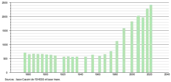 L'évolution du nombre d'habitants est connue à travers les recensements de la population effectués dans la commune depuis 1876. Pour les communes de moins de 10 000 habitants, une enquête de recensement portant sur toute la population est réalisée tous les cinq ans, les populations légales des années intermédiaires étant quant à elles estimées par interpolation ou extrapolation[24]. Pour la commune, le premier recensement exhaustif entrant dans le cadre du nouveau dispositif a été réalisé en 2007[25].