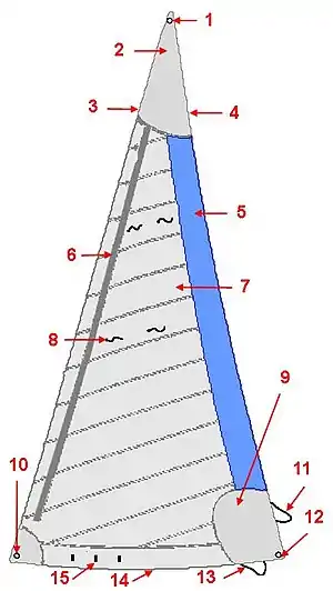 - La bordure (14) est le côté de la voile parallèle au pont : c'est le bas de la voile lorsque celle-ci est hissée : sa tension est réglée par un nerf de bordure (13).