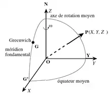 Comme système fondamental de coordonnées terrestres on utilise désormais volontiers un système de coordonnées spatiales cartésiennes X, Y, Z dont l'origine O est au centre des masses de la Terre, et tournant avec celle-ci. L'axe OZ coïncide avec l' axe de rotation moyen de la Terre. Le plan de l'équateur moyen est perpendiculaire à cet axe OZ, et donc contenu dans le plan OXY. Historiquement, une ancienne convention fixait que le plan OXZ contenait le plan méridien moyen de Greenwich, correspondant à la longitude « moyenne » de l'Observatoire de Greenwich, dans la banlieue de Londres. Ce n'est désormais plus le cas, le méridien de référence étant calculé par synthèse des observations des 4 techniques pré-citées sous forme d'un système de référence mondial, l'International Terrestrial Reference System. Ce calcul est mené au Laboratoire LAREG de l'IGN et celui-ci, intégrant au mieux les vitesses des plaques tectoniques, a conduit à un méridien de référence désormais significativement différent de celui de Greenwich.