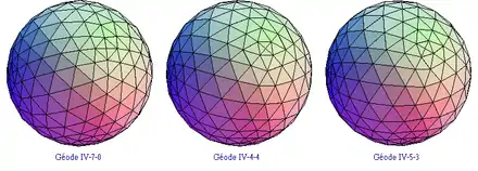 Dans le premier exemple, on a divisé les arêtes des faces de l'icosaèdre en deux segments. Dans le second, les arêtes ont été divisées en trois. Enfin, dans le dernier, elles ont été divisées en dix segments. C'est d'ailleurs sur ce dernier modèle qu'est bâtie la Géode de la Cité des sciences et de l'industrie de la Villette.