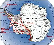 L'autre partie du continent est appelée Antarctique occidental ; elle comprend la terre Marie Byrd, la terre d’Ellsworth et la péninsule Antarctique, dont la partie la plus large est la terre de Palmer, alors que son étroite extrémité nord constitue la terre de Graham.