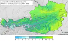 L'intervalle des moyennes annuelles de température est en Autriche de 11 °C pour le centre du district de Vienne, à moins de −9 °C au sommet du Groszglockner. Dans les vallées les plus encaissées, la température moyenne annuelle ne varie qu'entre 8 °C et 10 °C. La température moyenne du pays est de 6,0 °C. L'isotherme de gel se situe en moyenne annuelle à 2 200 m. Dans les vallées encaissées et les cirques, entre 800 et 1 200 m d'altitude, il n'est même pas rare que la température soit plus élevée avec l'altitude (couche d'inversion).