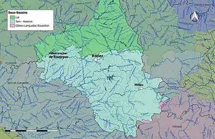Le réseau hydrographique de l'Aveyron est constitué d'environ 7 000 km de cours d'eau[1]. Il est dans sa quasi-totalité situé dans le bassin Adour-Garonne, se décomposant en deux sous-bassins administratifs : le bassin du Lot et le bassin Tarn-Aveyron (regroupant les bassins du Tarn et de l'Aveyron). Seule une frange sud-est se déverse vers le sud et appartient au bassin Côtiers du Languedoc-Roussillon, sous-bassin du bassin Rhône-Méditerranée.