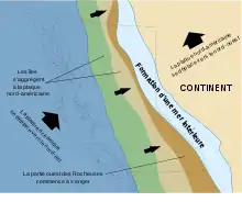Plusieurs millions d'années plus tard, la mer intérieure a totalement disparu. Le mouvement des plaques change de sens. La plaque nord-américaine se déplace vers le sud-est, tandis que la plaque océanique se déplace vers le nord-ouest. Ce changement de direction permet l'accrétion de l'île de Vancouver il y a 60 millions d'années.