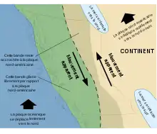 Il y a 135 millions d'années, le mouvement de la plaque nord-américaine s'accélère tandis que celui de la plaque océanique ralentit et s'oriente désormais vers le nord.