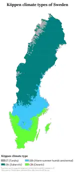 Le climat de la Suède présente d'importantes variations avec des gradients marqués de température et de précipitations. Selon la classification de Köppen, le climat est en majeure partie un climat continental (humide - Dfb et subarctique -Dfc), avec cependant un climat océanique (Cfb) sur les côtes du Sud et un climat de toundra (ET) dans les montagnes (au-delà de la limite des arbres)[9].