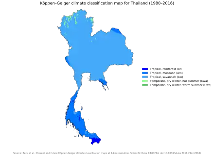 Le climat de la Thaïlande est influencé par les vents de mousson qui ont un caractère saisonnier (mousson du sud-ouest et du nord-est). La majeure partie du pays est classée comme climat de savane tropicale de Köppen . La majorité du sud ainsi que la pointe orientale de l'est ont un climat tropical de mousson . Certaines parties du sud ont également un climat de forêt tropicale humide .