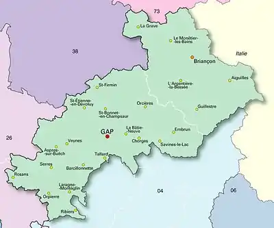 - Les six districts[réf. nécessaire] du nord du département (Briançonnais, Queyras, Guillestrois, Dévoluy, Embrunais, Champsaur-Valgaudemar) qui présentent les caractéristiques d'une zone alpine. 67 % des mailles ont une altitude minimale supérieure à 1 500 mètres.