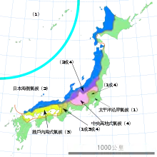 L'archipel japonais connaît de plus une alternance des vents et des courants marins qui influent sur son climat. Au Japon, on retient ainsi cinq zones climatiques pour le pays (voir carte à droite) :