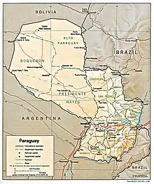 La frontière actuelle avec la Bolivie, au nord-ouest, date de 1938 (voir guerre du Chaco) et délimite les parties bolivienne et paraguayenne du Gran Chaco.