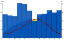 | Précipitations (mm) | 55,9 | 53,1 | 51,5 | 82 | 79,9 | 64,4 | 40,6 | 55,9 | 57,1 | 65,4 | 60 | 65,1 | 730,9 |