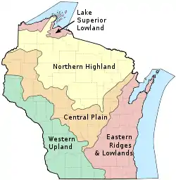 Avec son emplacement entre les Grands Lacs et le fleuve Mississippi, le Wisconsin abrite une grande variété de caractéristiques géographiques. L'État peut généralement être divisé en cinq régions distinctes : les basses terres du lac Supérieur (Lake Superior Lowland), les Hautes terres du nord (Northern Highland), la Plaine centrale (Central Plain), les Hautes terres occidentales (Western Upland) et les Crêtes et les Basses terres orientales (Eastern Ridges & Lowlands). Le géographe Lawrence Martin (en) (1880-1955) a créé ce schéma pour diviser l'État en grandes régions géographiques. Ces différentes régions sont définies par les différents effets qu'ont eu les glaciers pendant la glaciation du Wisconsin[15], dernière grande glaciation en Amérique du Nord qui s'est achevée il y environ 14 500 ans.