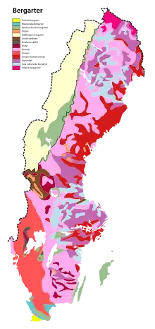 La principale région du pays est une région de socle appartenant au bouclier baltique (aussi appelé bouclier fennoscandien)[N 1]. Ce bouclier est formé principalement de roches magmatiques issues de plusieurs orogenèses précambriennes (c'est-à-dire datant d'il y a plus de 570 Ma)[N 1]. Dans son ensemble, le socle suédois est constitué pour deux tiers de granites ou de roches similaires, souvent métamorphisé en gneiss[G 1].