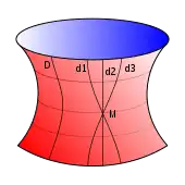 Les géométries de Lobatchevski et Bolyai correspondent à des structures hyperboliques où il existe une infinité de parallèles passant par un même point. Cette situation est illustrée dans la figure ci-contre, les droites d1, d2 et d3 sont trois exemples de parallèles à D passant par le point M. Les trois premières droites sont dites parallèles à D car aucune d'entre elles n'est sécante avec D ; mais pourtant ces trois droites ne sont pas parallèles entre elles (le parallélisme des droites n’est plus une propriété transitive dans une géométrie hyperbolique).