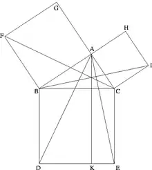 La fin du XIXe siècle voit non seulement la multiplication de critiques de cette nature, mais aussi la formulation de postulats manquants. Georg Cantor (1845-1918) et Richard Dedekind (1831-1916) montrent la nécessité d'un postulat de la continuité et le formalisent[25]. Un exemple du manque est donné par le théorème de Pythagore dont la figure de gauche illustre une démonstration. Les triangles IBC et AEC possèdent la même aire car l'un correspond à la rotation d'un quart de tour de l'autre. Cette assertion n'est pas démontrable dans le cadre axiomatique choisi par Euclide. Comme illustrée sur la figure de droite, la rotation d'un huitième de tour de la diagonale d'un carré de côté 1 ne possède pas, a priori son extrémité A' si l'ensemble de nombres choisi n'est pas celui des réels mais des rationnels. Chez Euclide aucune indication n'est donnée sur la nature des nombres utilisés, aucune information ne permet non plus d'établir qu'une rotation ou une symétrie conserve les distances[réf. nécessaire].