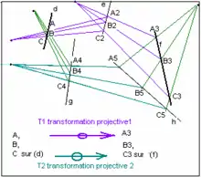 - Les 4 points (les 3 points invariants plus le 4e défini ci-dessus) définissent un repère projectif (voir plus haut) et la connaissance de la transformation de ce repère projectif détermine entièrement l'homographie.