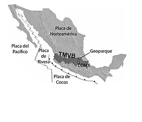 À cette période, le volcanisme changea de style et composition, en obéissant à la subduction subhorizontale de la plaque de Cocos en dessous de la plaque nord-américaine, et configurant l'axe volcanique transversal, encore actif dans le présent. On trouve des exemples de roches volcaniques du Pliocène aux géosites :