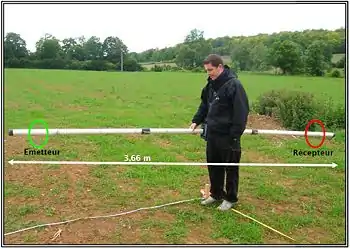 L’appareil est composé d’un émetteur et d’un récepteur (bobines) équidistants du point de mesure (la distance entre ces deux unités reste constante), et d’une interface avec un PC pour l’acquisition des mesures. On peut également ajouter un odomètre (système monté sur roue) pour déterminer la distance parcourue. L’onde électromagnétique envoyée est dans la gamme des hautes fréquences (225 MHz). Pour chaque mesure, elle est émise sous forme d’une impulsion répétée un certain nombre de fois, afin de faire une moyenne pour optimiser la précision des mesures.