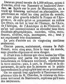 Dans Le Petit Journal du [26], on apprend que « Dans un grand terrain de 4000 mètres, entouré d'acacias, situé rue Nansouty et boulevard Jourdan, en façade sur le parc de Montsouris, on a tracé un Géorama universel ou planisphère » .... L'auteur de l'article décrit le site avec un certain enthousiasme et conclut « On ne saurait trop applaudir à l’heureuse et ingénieuse idée de M. Chardon, le créateur du Géorama universel de Montsouris ». D'autres journaux, comme La Presse[27], invitent à s'y promener en famille.
