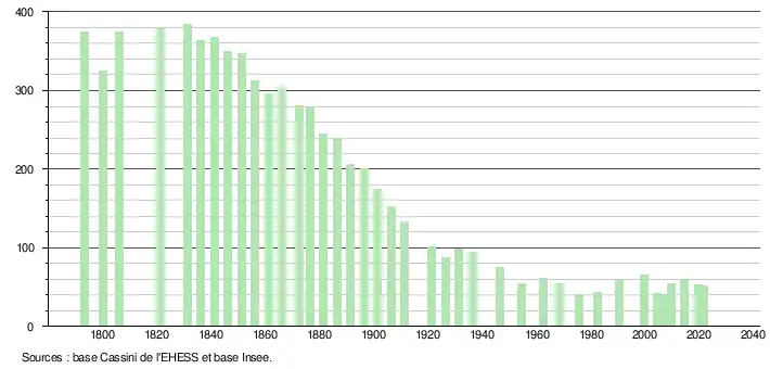 L'évolution du nombre d'habitants est connue à travers les recensements de la population effectués dans la commune depuis 1793. Pour les communes de moins de 10 000 habitants, une enquête de recensement portant sur toute la population est réalisée tous les cinq ans, les populations légales des années intermédiaires étant quant à elles estimées par interpolation ou extrapolation[17]. Pour la commune, le premier recensement exhaustif entrant dans le cadre du nouveau dispositif a été réalisé en 2004[18].