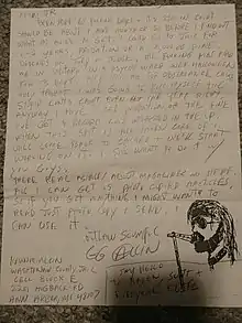 GG Allin, de son vrai nom Kevin Michael Allin, né Jesus Christ Allin à Lancaster (New Hampshire), le et mort à New York le , est un chanteur de punk hardcore américain. Il est connu pour ses performances scéniques qui incluaient des actions transgressives telles qu'Allin déféquant sur scène, s'automutilant, chantant nu[4], mettant les gens au défi de lui faire une fellation, et de multiples actes de violence envers le public. Bien que plus réputé pour son jeu de scène que pour sa production musicale, il enregistra de façon prolifique avec plusieurs groupes, non seulement du hardcore, mais également du spoken word[5], de la country[6], ainsi qu'un type de rock inspiré des Rolling Stones[7].
