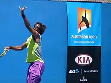 La saison 2011 de Gaël Monfils débute au tournoi d'exhibition de Kooyong, où il bat le no 9 mondial et tenant du titre Fernando Verdasco 4-6, 7-65, 6-4. La semaine suivante, après un premier tour difficile où il bat difficilement Thiemo de Bakker en cinq sets (65-7, 2-6, 7-5, 6-2, 6-1), il chute au troisième tour de l'Open d'Australie contre Stanislas Wawrinka (64-7, 2-6, 3-6)[36]. À l'entame de la saison nord-américaine sur dur, il atteint le dernier carré de l'Open de San José mais déclare forfait contre Milos Raonic à cause d'une blessure au poignet qui le force à s'arrêter deux mois.