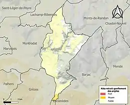 Le retrait-gonflement des sols argileux est susceptible d'engendrer des dommages importants aux bâtiments en cas d’alternance de périodes de sécheresse et de pluie. 1,2 % de la superficie communale est en aléa moyen ou fort (15,8 % au niveau départemental et 48,5 % au niveau national). Sur les 96 bâtiments dénombrés sur la commune en 2019, aucun n'est en aléa moyen ou fort, à comparer aux 14 % au niveau départemental et 54 % au niveau national. Une cartographie de l'exposition du territoire national au retrait gonflement des sols argileux est disponible sur le site du BRGM[21],[Carte 2].