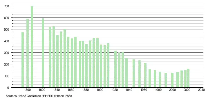 L'évolution du nombre d'habitants est connue à travers les recensements de la population effectués dans la commune depuis 1793. Pour les communes de moins de 10 000 habitants, une enquête de recensement portant sur toute la population est réalisée tous les cinq ans, les populations légales des années intermédiaires étant quant à elles estimées par interpolation ou extrapolation[25]. Pour la commune, le premier recensement exhaustif entrant dans le cadre du nouveau dispositif a été réalisé en 2007[26].