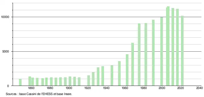 - Par convention dans Wikipédia, le principe a été retenu de n’afficher dans le tableau des recensements et le graphique, pour les populations légales postérieures à 1999, que les populations correspondant à une enquête exhaustive de recensement pour les communes de moins de 10 000 habitants, et que les populations des années 2006, 2011, 2016, etc. pour les communes de plus de 10 000 habitants, ainsi que la dernière population légale publiée par l’Insee pour l'ensemble des communes.