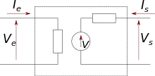 Un élément de circuit électrique ou électronique se raisonne fréquemment sous la forme d'un quadripôle[4]. La notion de gain se développe le plus facilement à partir du modèle quadripôle d'un amplificateur. Dans ce modèle, l'amplificateur se résume à une impédance d'entrée associée à un générateur de tension et à une impédance de sortie. Par définition, le générateur produit une tension V égale à celle de l'entrée, Ve, multipliée par un coefficient, le « rapport de transfert[5] ».