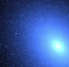 - galaxies elliptiques naines (Dwarf elliptical galaxies : dE) : Ce groupe de galaxies est fondamentalement différent des elliptiques normales. Leur diamètre est d’un ordre de 1 à 10 kiloparsecs, avec une luminosité de surface qui est bien plus basse que les elliptiques normales, ce qui leur donne une apparence bien plus diffuse. Elles montrent les mêmes caractéristiques de déclin graduel de la densité des étoiles d’un centre relativement dense vers une périphérie diffuse ;
