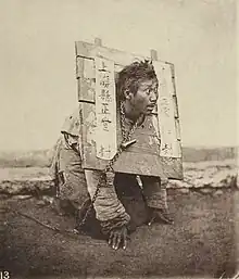 "...ils lui ont jeté les fers aux pieds et aux mains et après cela une planche autour du cou. . . . Sur cette planche qui tombe vers l'avant, sa condannation y est écrite en grosses lettres. . . Et c'est ainsi que cette tablette est un grand tourment, parce qu'un homme ne peut ni dormir ni manger, parce que ses mains sont sous la planche avec des menottes aux mains, et qu'il n'y a aucun moyen de vivre."- Quelques choses connues de Chine, Galeote Pereira.