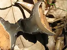 Les espèces comparables comprennent Bulgaria inquinans (à gauche), Sarcosoma globosum (au centre) et Wolfina aurantiopsis (à droite)