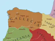 Toutefois, on utilise le terme de Gallaecia pour désigner le nord-ouest de la péninsule Ibérique jusqu'à l'installation du royaume suève dans la région en 410, voire au-delà.