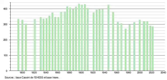 L'évolution du nombre d'habitants est connue à travers les recensements de la population effectués dans la commune depuis 1793. Pour les communes de moins de 10 000 habitants, une enquête de recensement portant sur toute la population est réalisée tous les cinq ans, les populations légales des années intermédiaires étant quant à elles estimées par interpolation ou extrapolation[19]. Pour la commune, le premier recensement exhaustif entrant dans le cadre du nouveau dispositif a été réalisé en 2007[20].
