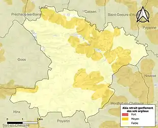 Le retrait-gonflement des sols argileux est susceptible d'engendrer des dommages importants aux bâtiments en cas d’alternance de périodes de sécheresse et de pluie. 32,9 % de la superficie communale est en aléa moyen ou fort (19,2 % au niveau départemental et 48,5 % au niveau national). Sur les 552 bâtiments dénombrés sur la commune en 2019, 147 sont en aléa moyen ou fort, soit 27 %, à comparer aux 17 % au niveau départemental et 54 % au niveau national. Une cartographie de l'exposition du territoire national au retrait gonflement des sols argileux est disponible sur le site du BRGM[21],[Carte 2].