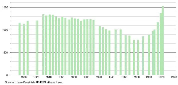 | L'évolution du nombre d'habitants est connue à travers les recensements de la population effectués dans la commune depuis 1793. Pour les communes de moins de 10 000 habitants, une enquête de recensement portant sur toute la population est réalisée tous les cinq ans, les populations légales des années intermédiaires étant quant à elles estimées par interpolation ou extrapolation[23]. Pour la commune, le premier recensement exhaustif entrant dans le cadre du nouveau dispositif a été réalisé en 2008[24]. En 2021, la commune comptait 1 518 habitants[Note 3], en augmentation de 23,82 % par rapport à 2015 (Landes : +4,9 %, France hors Mayotte : +1,84 %). |