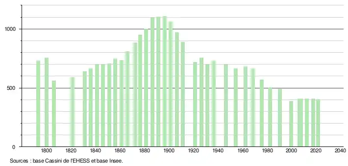 L'évolution du nombre d'habitants est connue à travers les recensements de la population effectués dans la commune depuis 1793. Pour les communes de moins de 10 000 habitants, une enquête de recensement portant sur toute la population est réalisée tous les cinq ans, les populations légales des années intermédiaires étant quant à elles estimées par interpolation ou extrapolation[16]. Pour la commune, le premier recensement exhaustif entrant dans le cadre du nouveau dispositif a été réalisé en 2007[17].